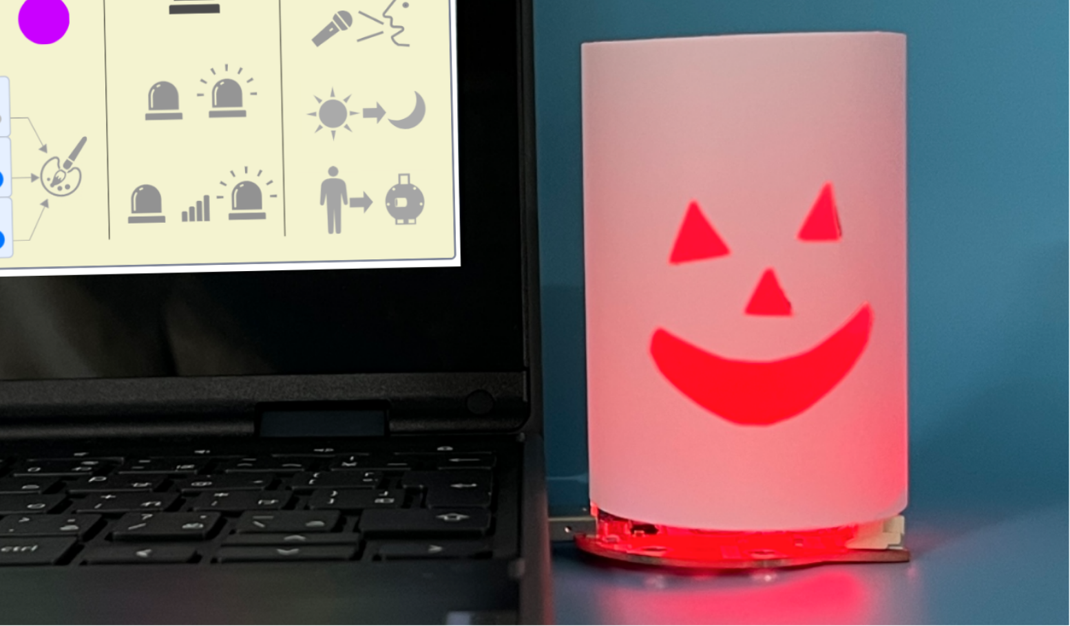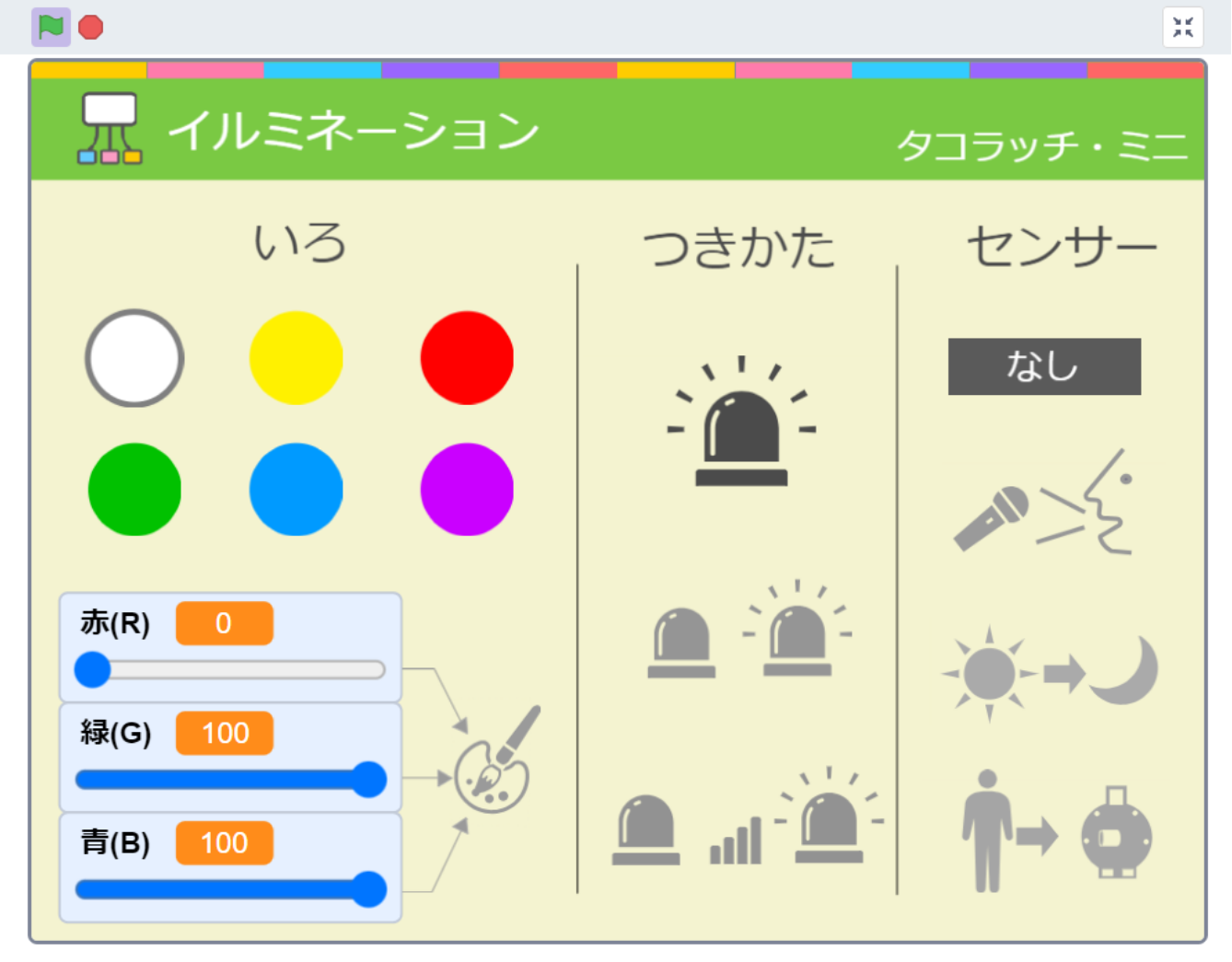4. 「いろ」「つきかた」「センサー」を組み合わせてオリジナルイルミネーションを完成させる。