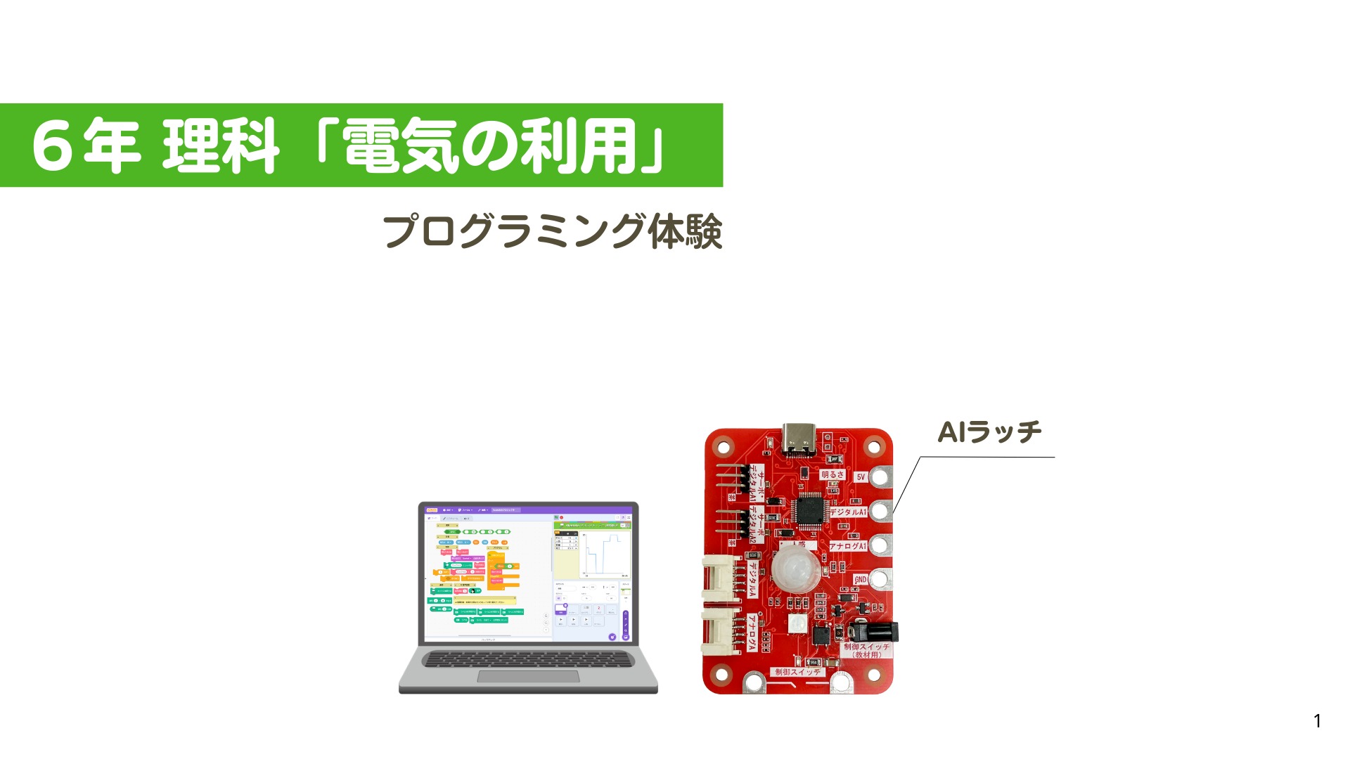 「電気の利用」の学習のうち、「身の回りには,温度センサーなどを使って,エネルギーを効率よく利用している道具があることに気付き,実際に目的に合わせてセンサーを使い,モーターの動きや発光ダイオードの点灯を制御するなどといったプログラミングを体験することを通して,その仕組みを体験的に学習する」の場面での活動例です。授業スライドと「課題解決プログラミングカード」を使えば、Scratch初心者でも安心してプログラミングの学習ができます。