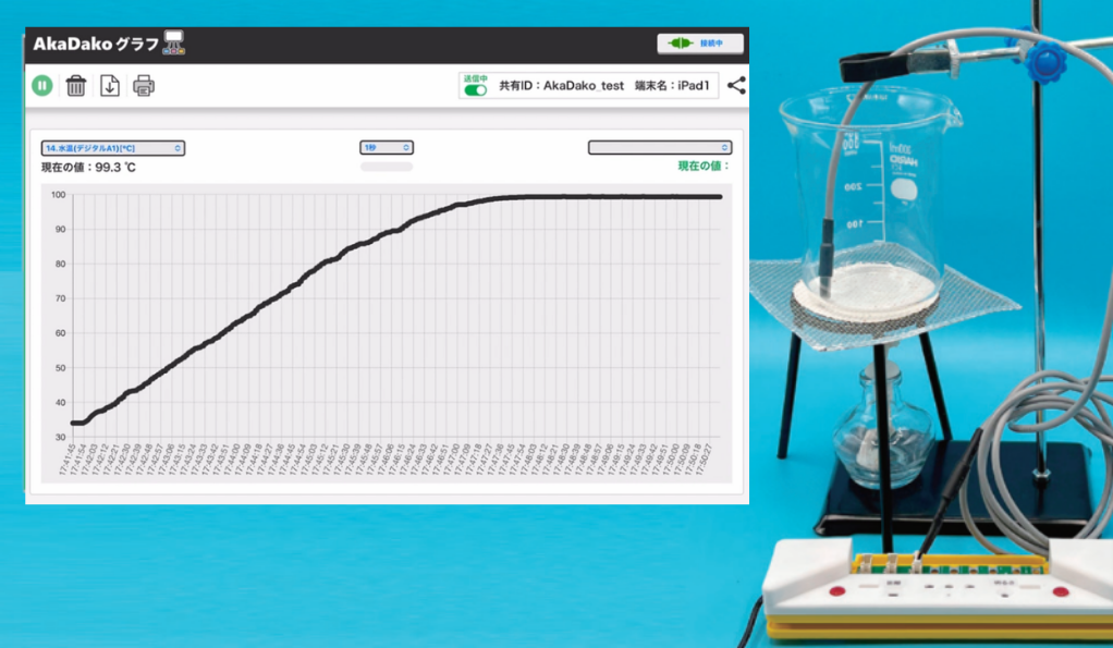 - AkaDakoファミリーと防水温度センサーを使うと、水温の変化をリアルタイムで可視化することができます。