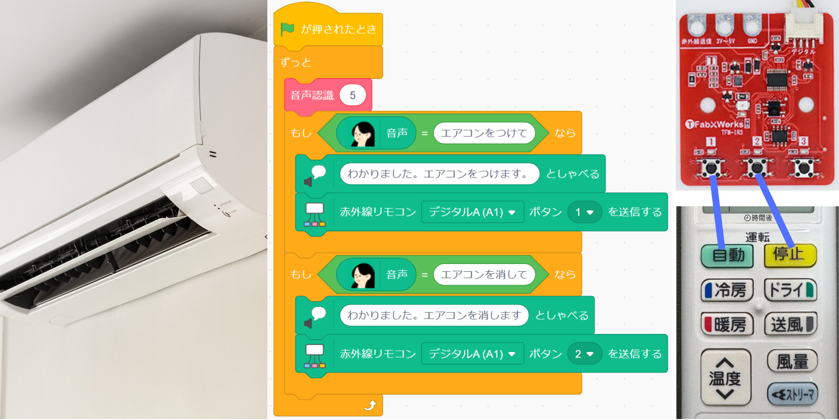 - 学校にリモコンで操作する家電がない場合は、安価のリモコン対応グッズをご購入いただくとプログラミングによるリモコン操作を体験できます。(例:ダイソーリモコンライト、ダイソーテープライト)