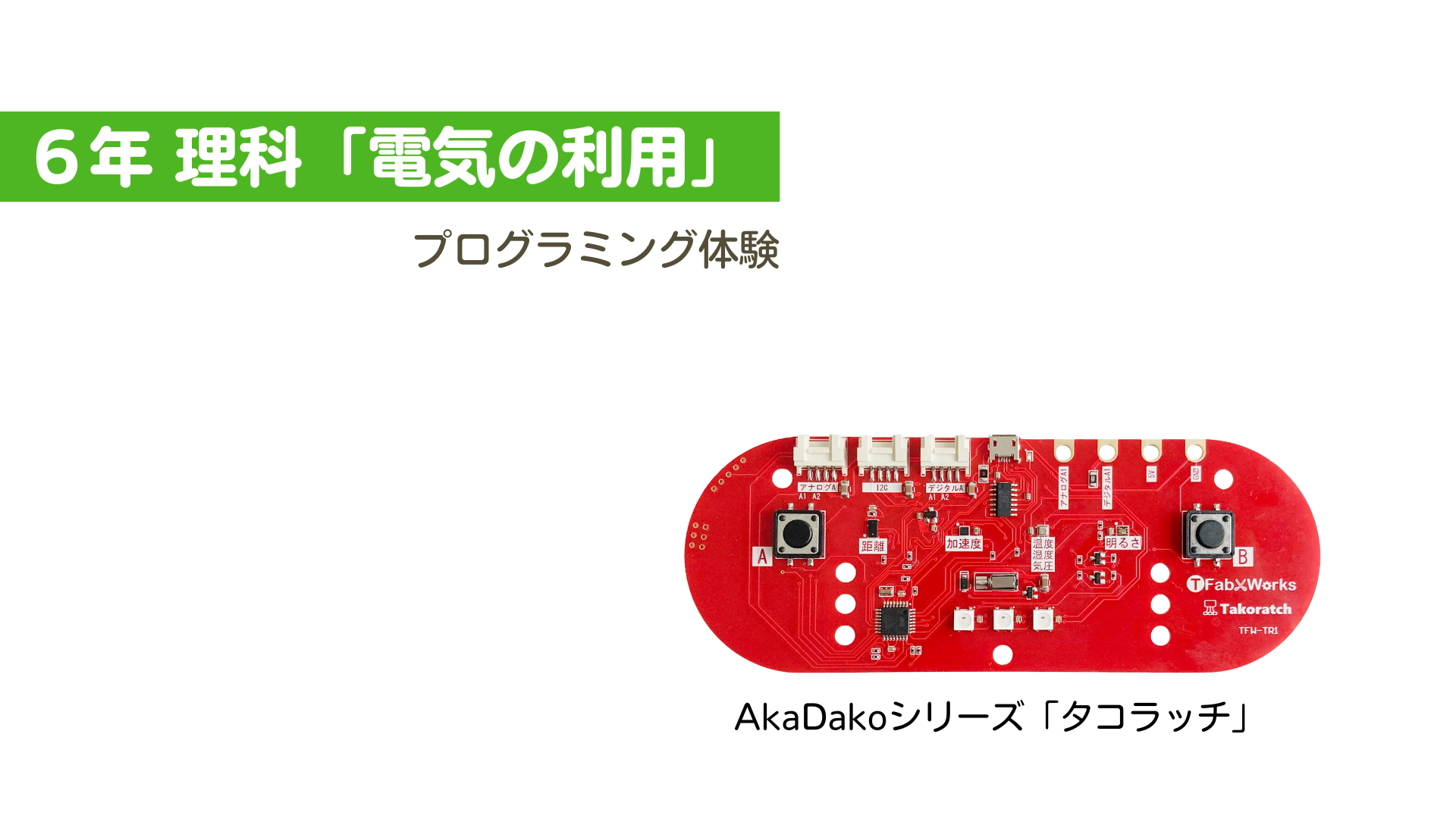 「電気の利用」の学習のうち、「身の回りには,温度センサーなどを使って,エネルギーを効率よく利用している道具があることに気付き,実際に目的に合わせてセンサーを使い,モーターの動きや発光ダイオードの点灯を制御するなどといったプログラミングを体験することを通して,その仕組みを体験的に学習する」の場面での活動例です。授業スライドと「課題解決プログラミングカード」を使えば、Scratch初心者でも安心してプログラミングの学習ができます。
