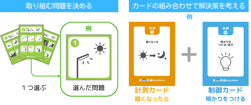 「省エネ」などの問題カードをヒントに、自分たちが解決したい身近な問題を探します。 その後、「計測カード」と「制御カード」を組み合わせて、解決アイデアを考えます。