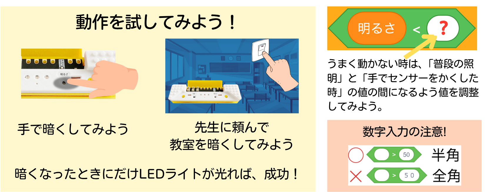 アイデアが固まったら、AkaDakoをPCに接続し、カード専用プログラミング環境を開きましょう。 センサーを手で隠すなどして、どのように反応するかを確認してみます。