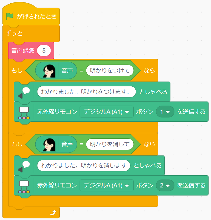 - 基本のプログラムが用意されています。「音声聞き取り中(5秒間)」が表示されている間に「明かりをつけて」もしくは「明かりを消して」と言ってください。AkaDakoに搭載されいてるLEDが制御できます。
