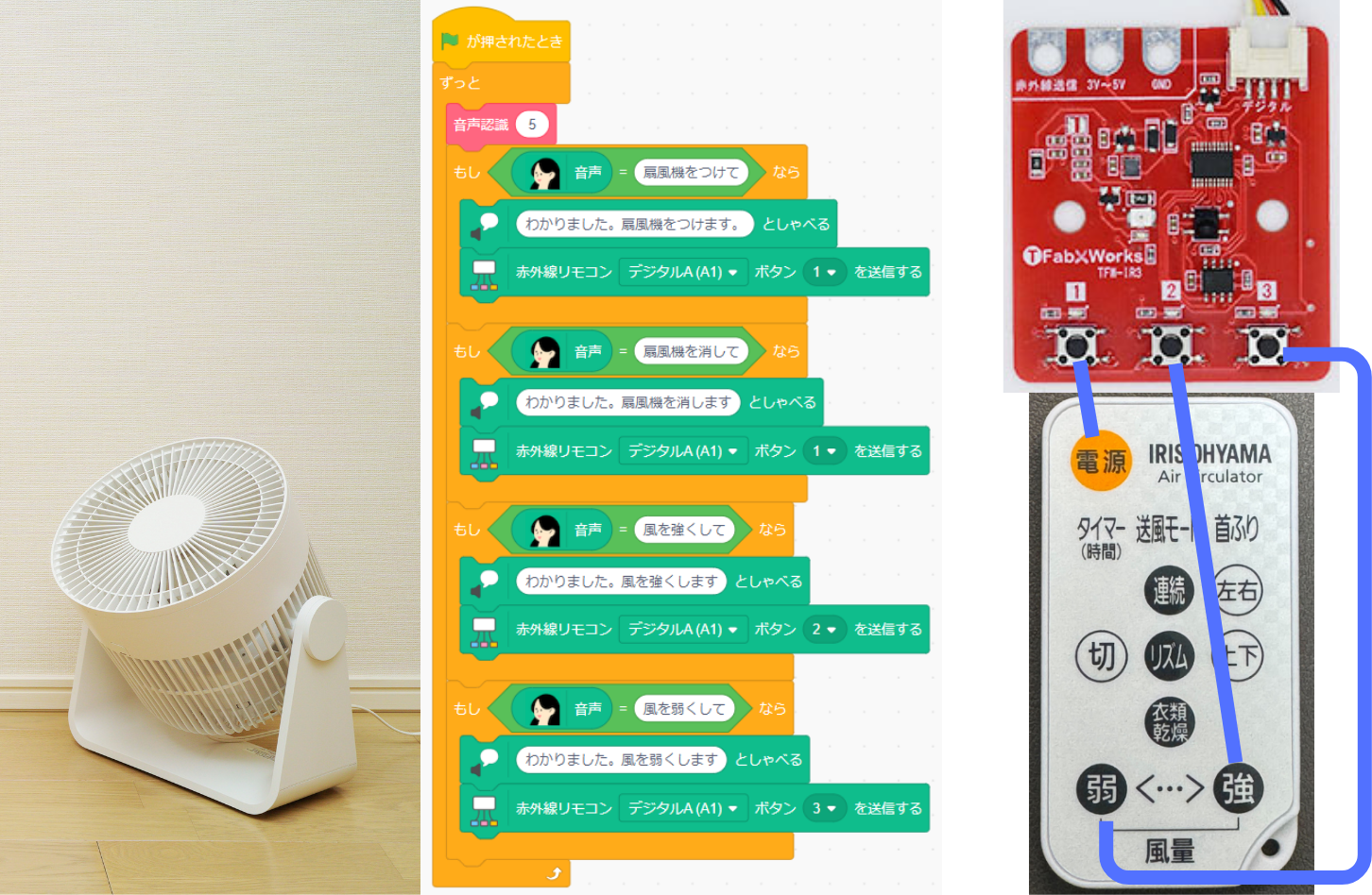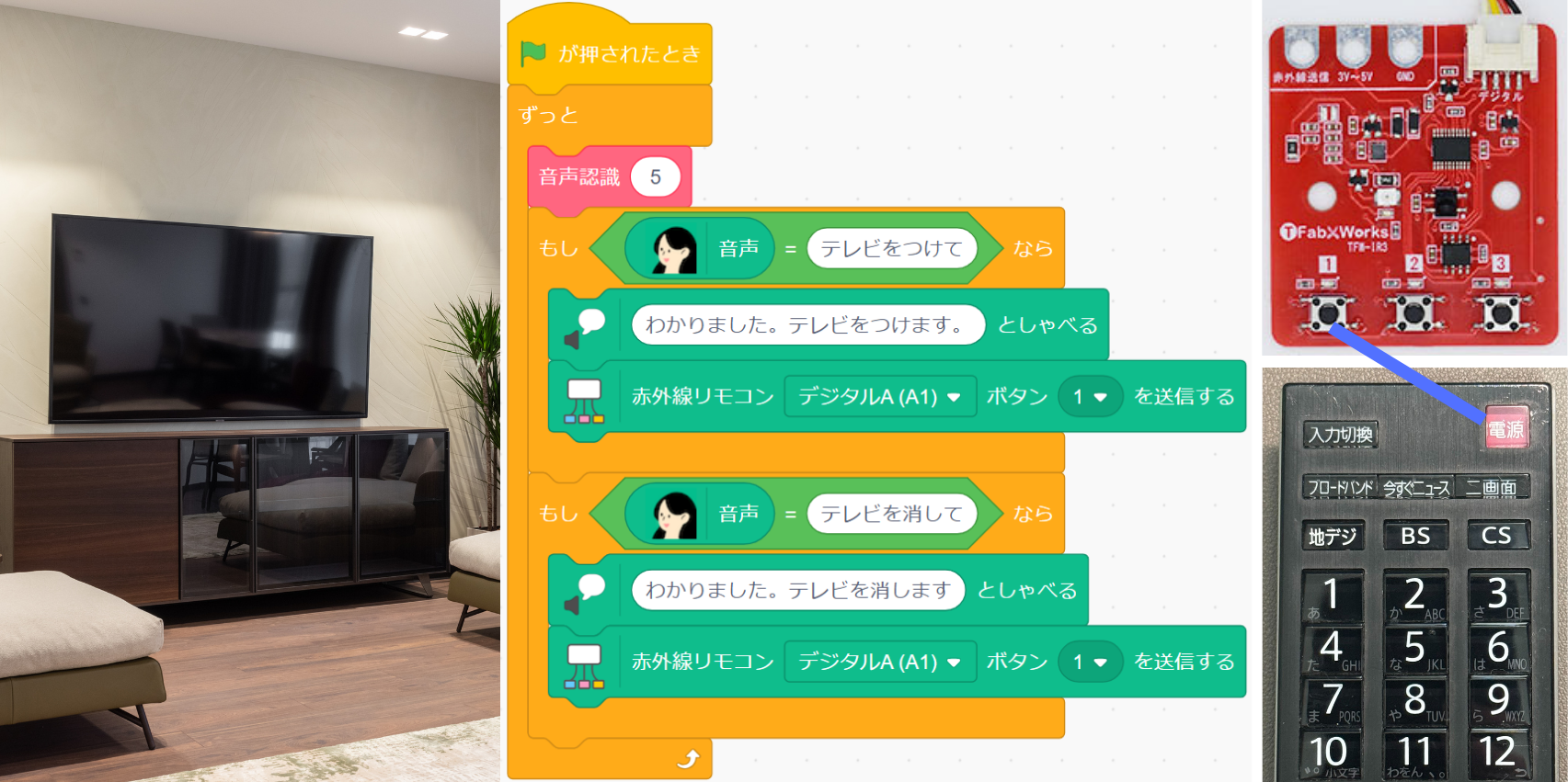 - 学校にリモコンで操作する家電がない場合は、安価のリモコン対応グッズをご購入いただくとプログラミングによるリモコン操作を体験できます。(例:ダイソーリモコンライト、ダイソーテープライト)