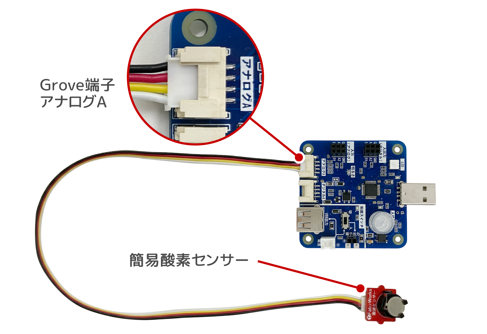- 空気センサーを50cmのGroveケーブルでアナログAに接続する。