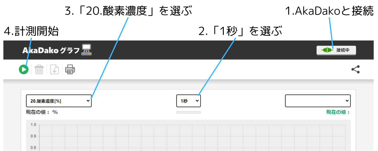 - グラフ左上のセレクターで「20.酸素濃度[%]」を選択する。計測間隔を「1秒」にする。