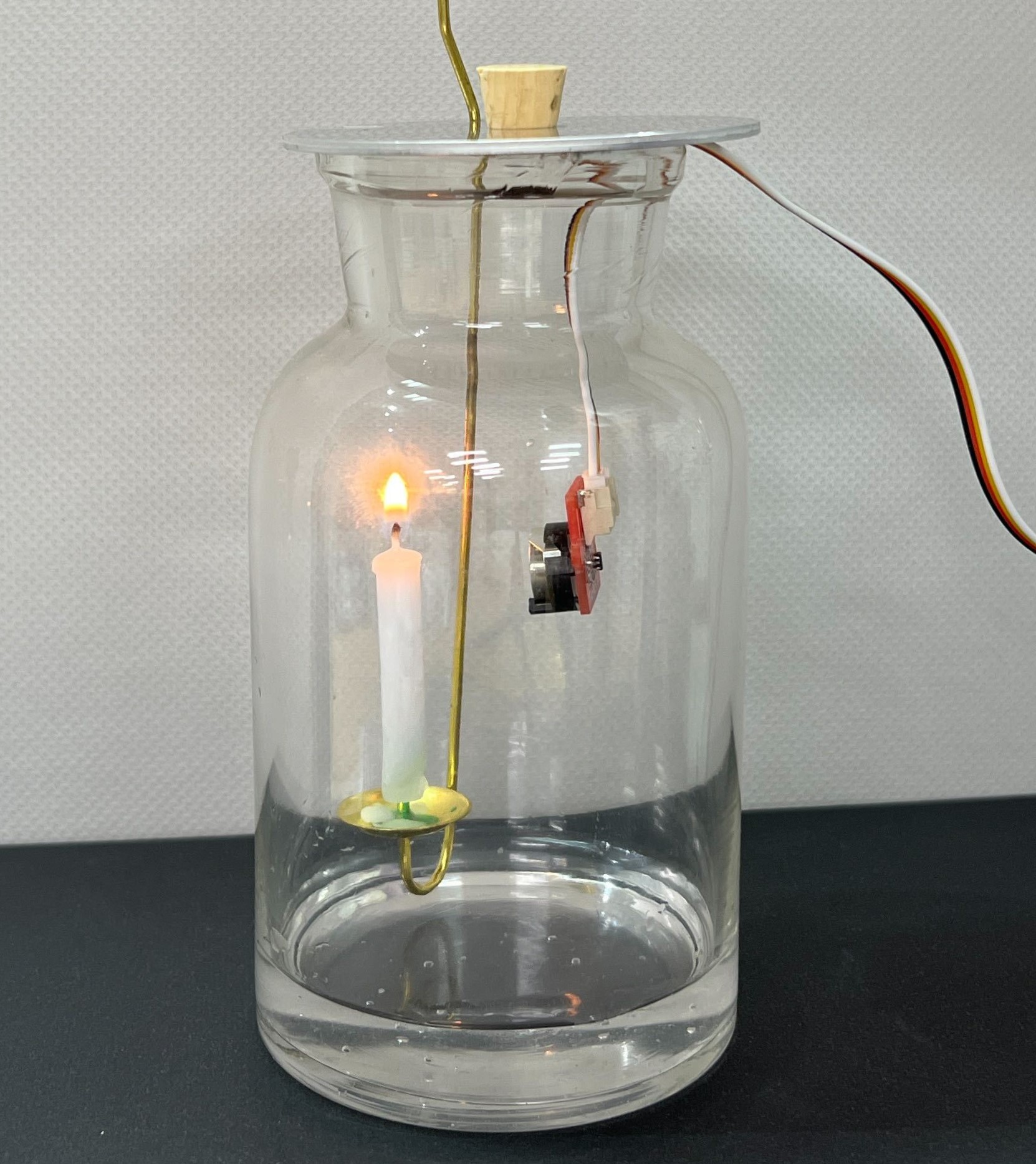 - Groveケーブルを焦がさないように注意しながら、火のついたろうそくを集気瓶に入れて蓋をする。