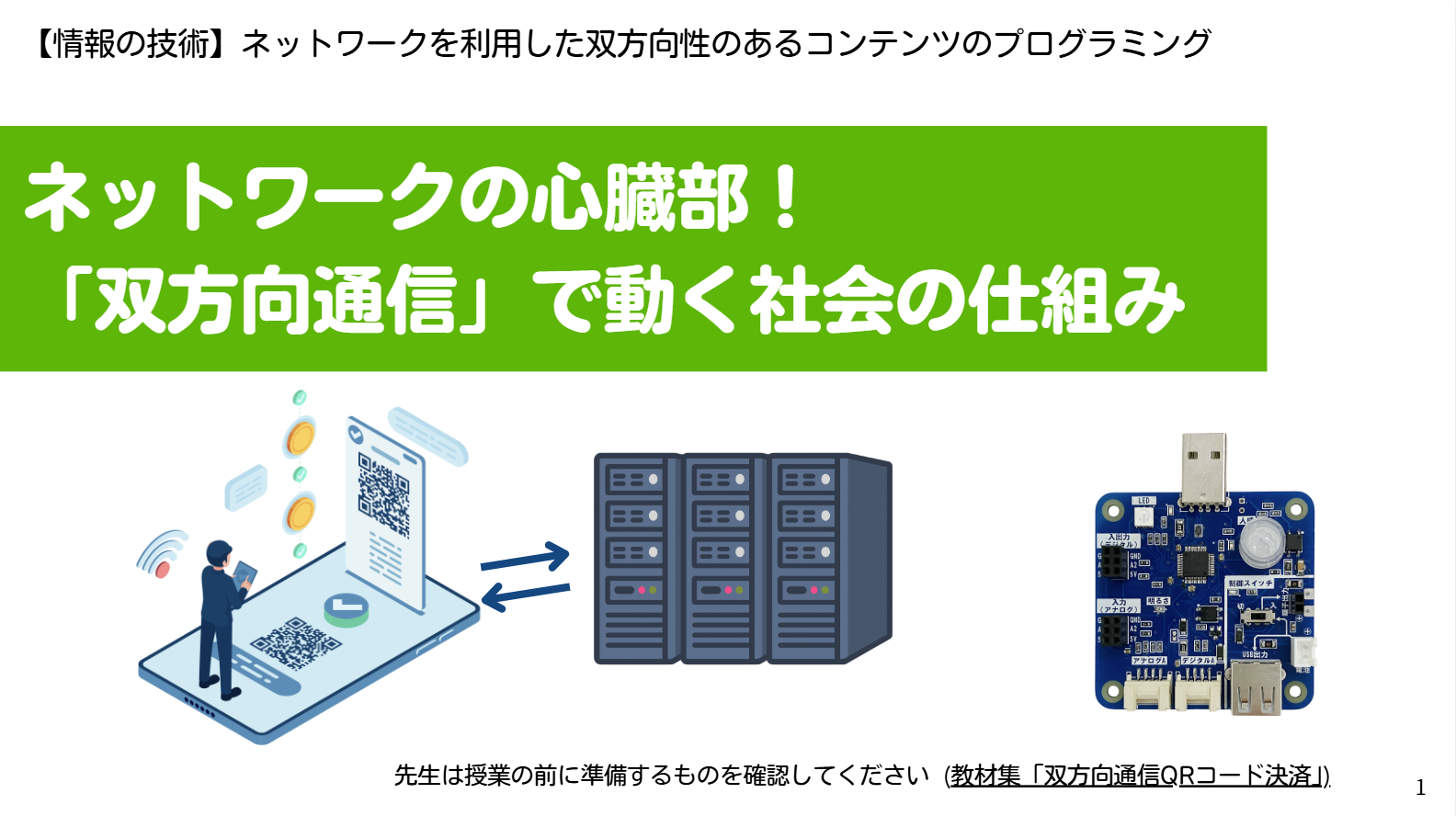 - 導入: YouTubeや自動改札などを例に、身の回りにはクライアントとサーバーによる「双方向通信」が多用されていることを示します 。その上で、本時の題材である「QRコード決済」の仕組みへの問いを立て、学習問題(ミッション)を提示します 。